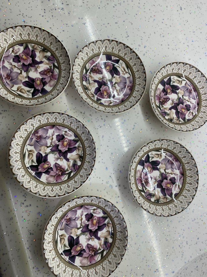 Bu tabak seti, açık mor çiçek desenleri ve klasik tasarıma sahip olup zarif çiçek motifleri içerir.