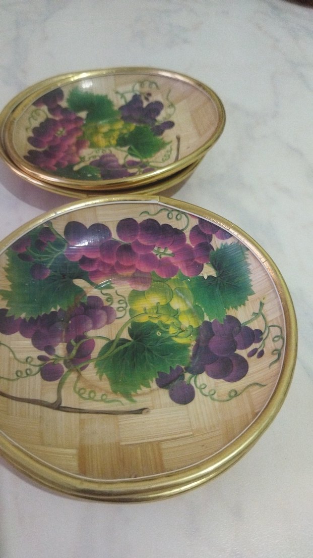 Mor üzüm ve yeşil yaprak desenli, altın kenarlıklı renkli tabak seti. ️ altı adet bambu cerezlik vintage