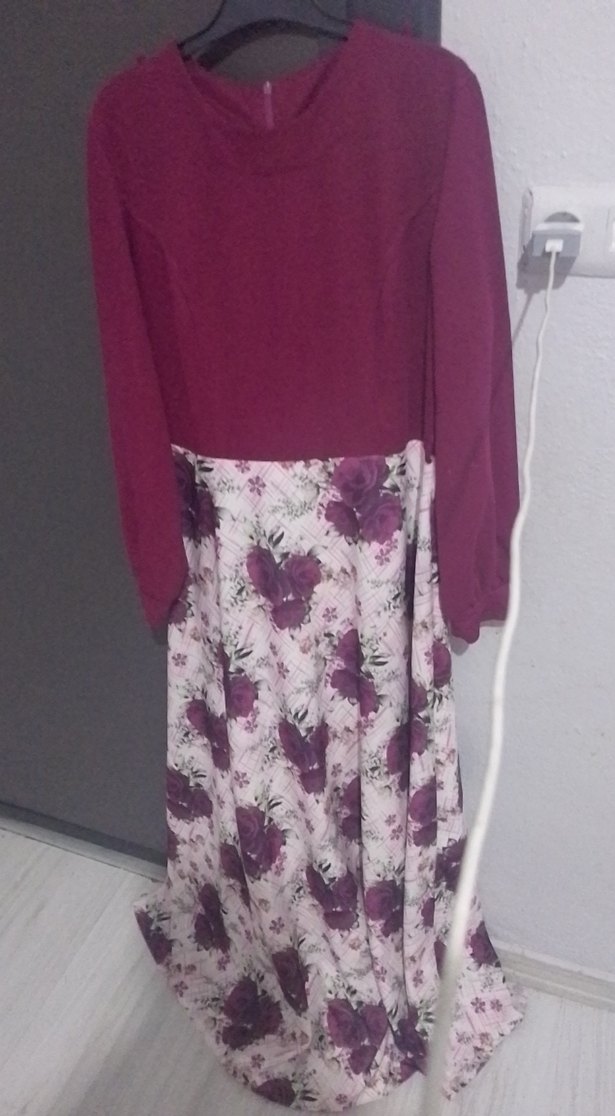 Mor renkte, uzun kollu ve yuvarlak yakalı, bol kesim bohem elbise. Alt kısmında çiçek desenleri ve drapeli detaylar bulunur. Günlük kullanıma uygundur.