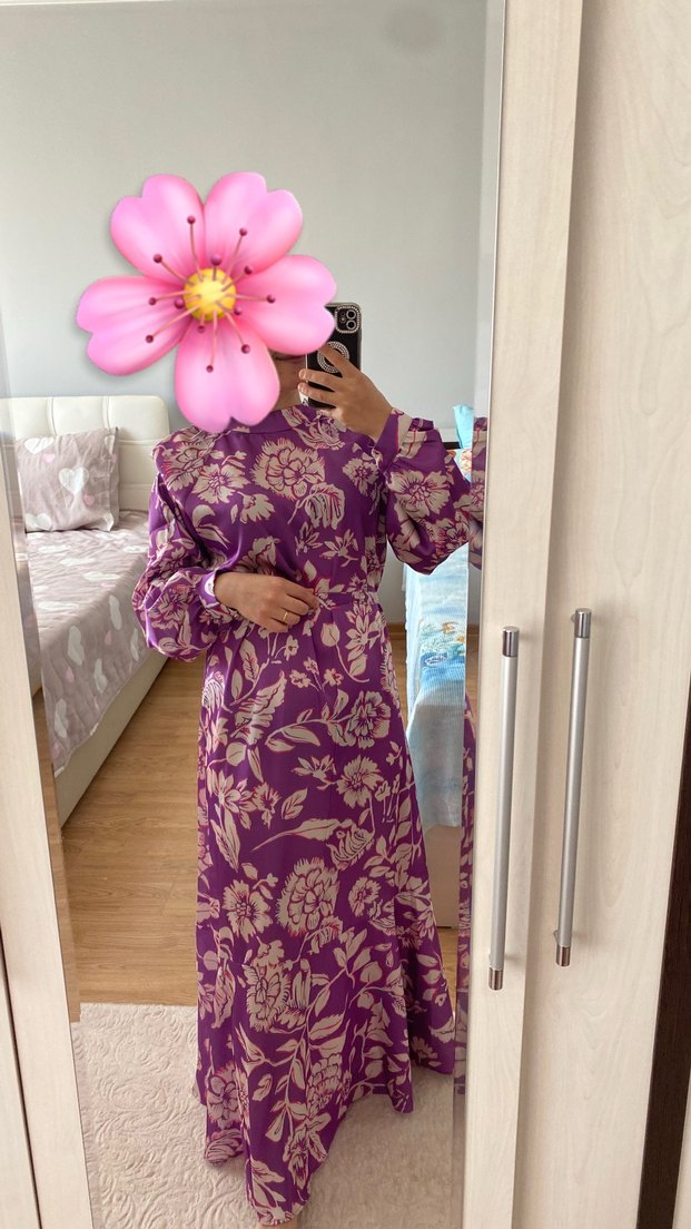 Mor renkte, yüksek yakalı ve uzun kollu, bol kesim uzun elbise. İpek gibi kumaştan, drapeli tasarıma ve pastel çiçek desenine sahip tarz elbise.