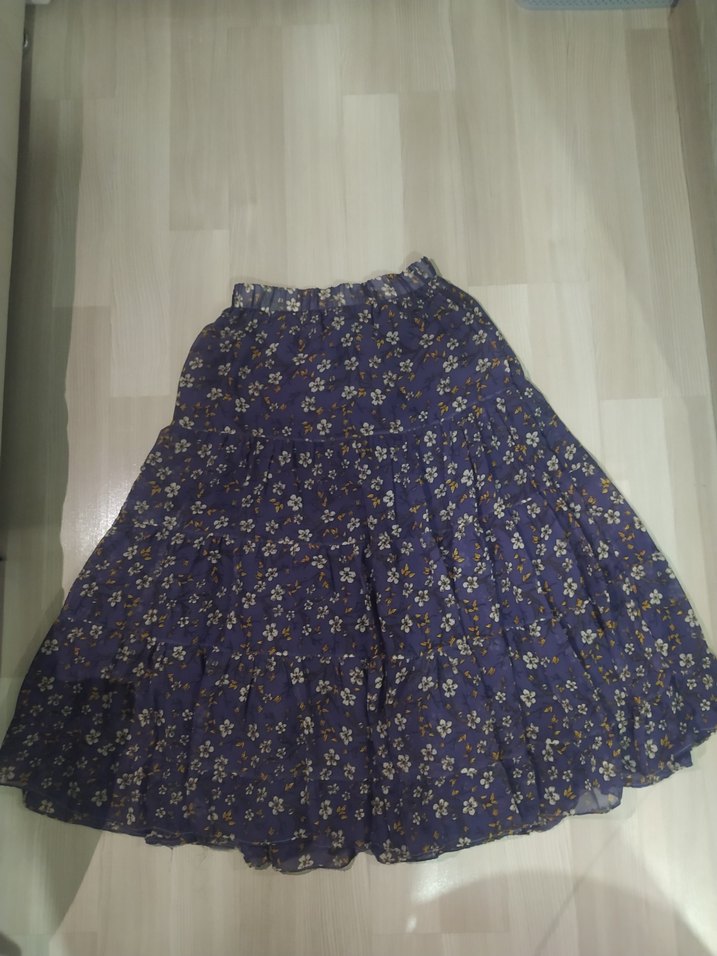 Sentetik kumaştan yapılmış, bol kesim, çiçek desenli ve fırfırlı mor uzun etek.