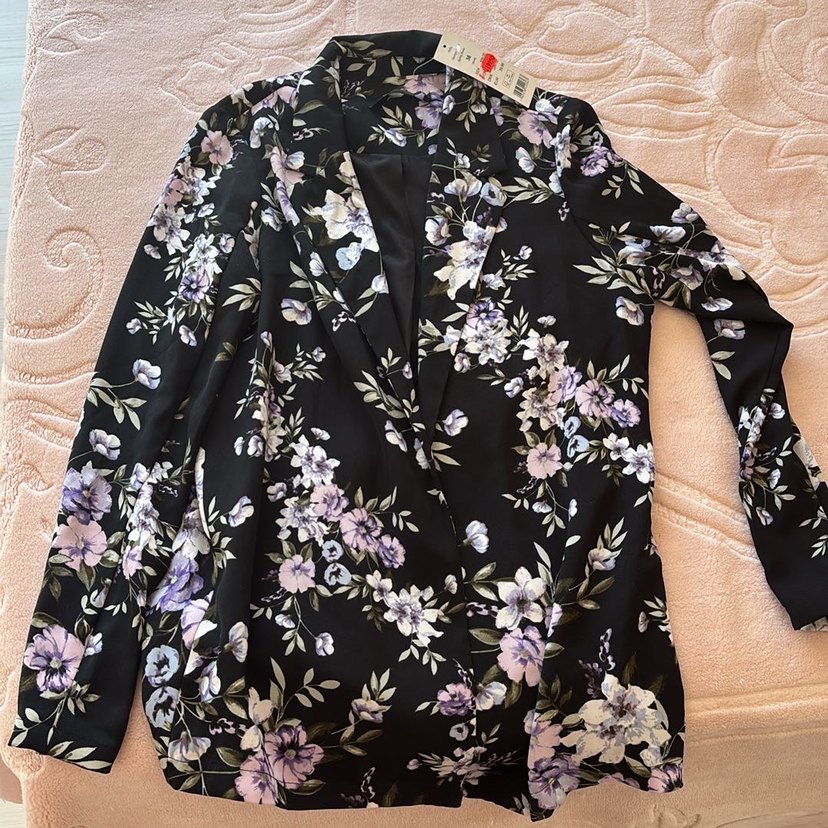 Mor çiçek desenli, düğmeli, uzun kollu, notched lapel yakalı, bol kesim kimono. Sentetik kumaştan yapılmıştır, ofis için uygundur. Etiketli giyilmedi