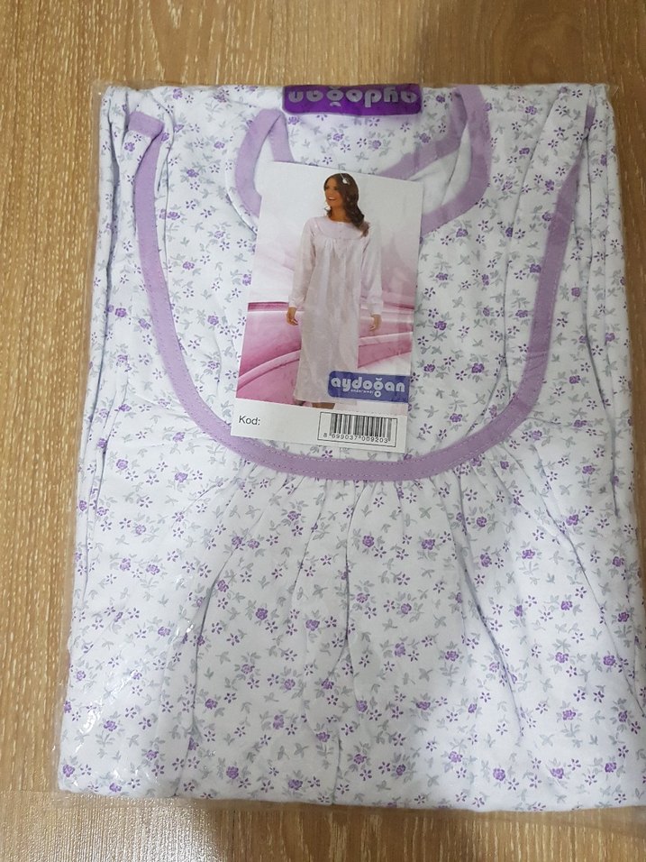 Mor çiçek desenli, uzun kollu, pamuk, bol kesim kadın gecelik. Pastel tonlarda ve rahat uzunlukta