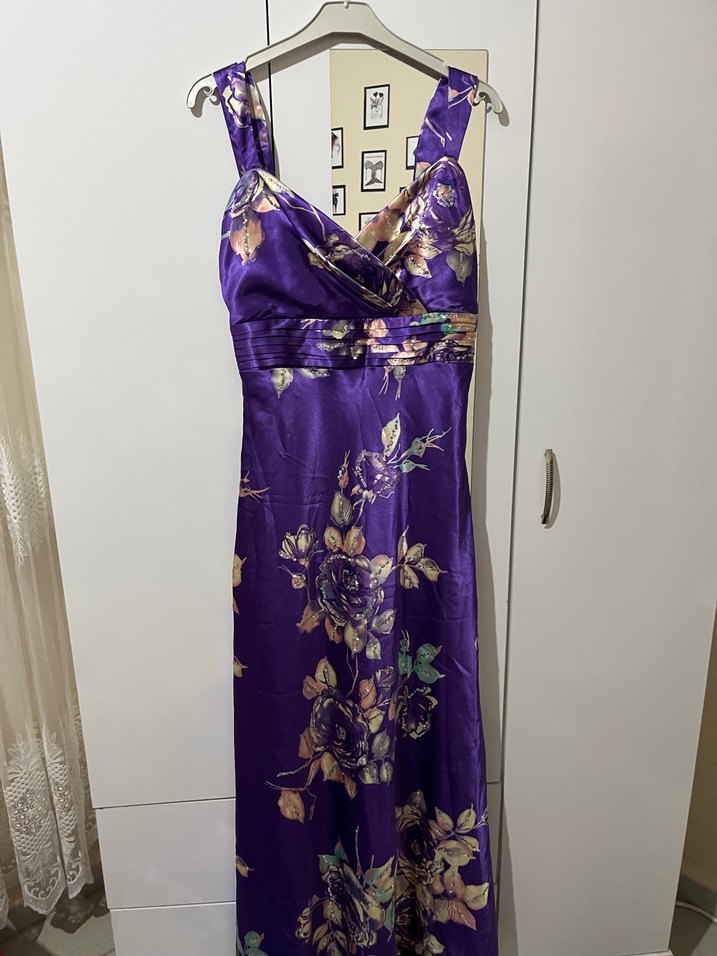 Mor Çiçek Desenli Uzun Saten Elbise