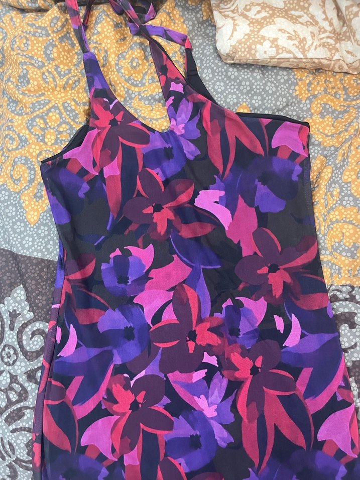 Mor tonlarda çiçek desenli, askısız, drapeli ve uzun kesim tek kol elbise sentetik kumaştan, parti için uygun.