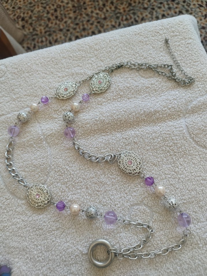 Detaylı çiçek desenli gümüş parçalar ve pastel mor boncuklarla uzun zincir kolye, bohem tarz için uygun.