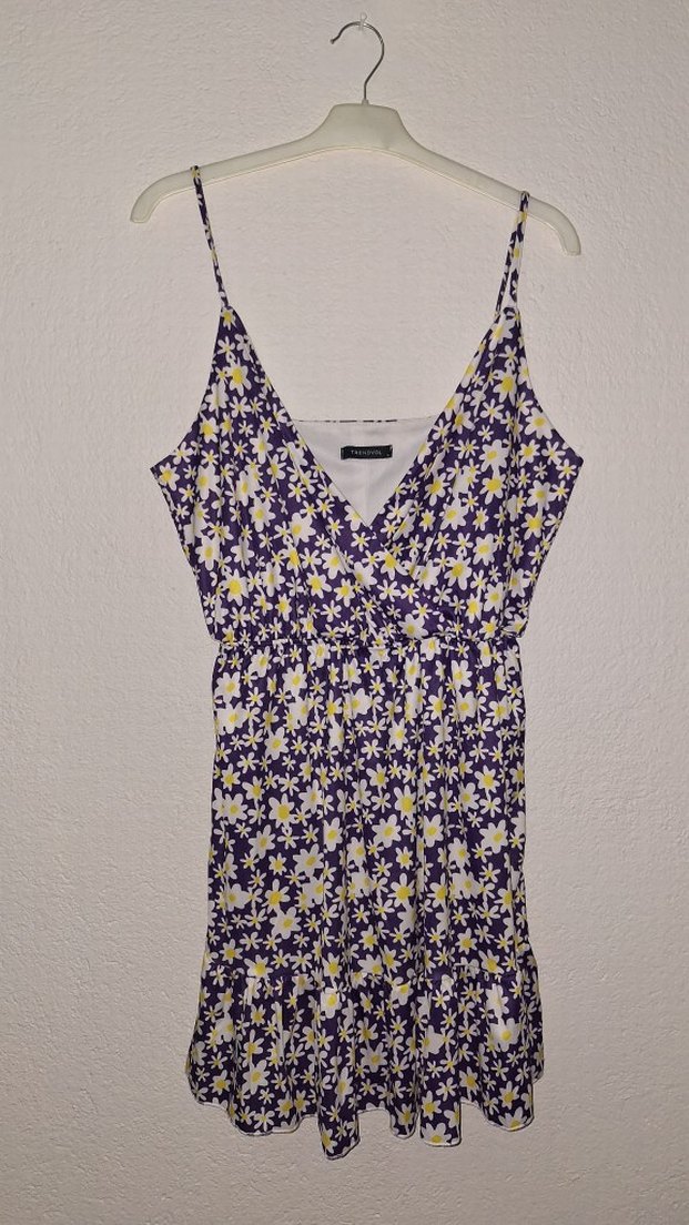 Mor renk, çiçek desenli, V yakalı ve kolsuz mini elbise. Fitted kesimiyle günlük sokak stiline uygundur.