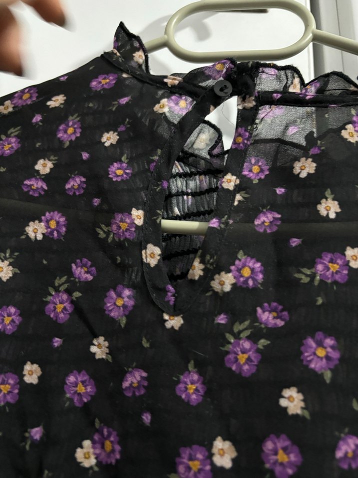 V yakalı, fırfırlı ve mor çiçek desenli, yumuşak sentetik kumaştan yapılmış, bohem tarzda, fitted kesim bluz. Uzun kol günlük kullanıma uygun. GÖMLEĞİN İÇİ GÖRÜNÜYOR MODELİ BU