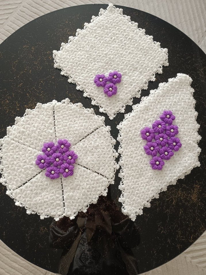 Mor çiçek detaylı beyaz el örgüsü lif seti, farklı şekillerde ve ince işçilikle hazırlanmıştır.