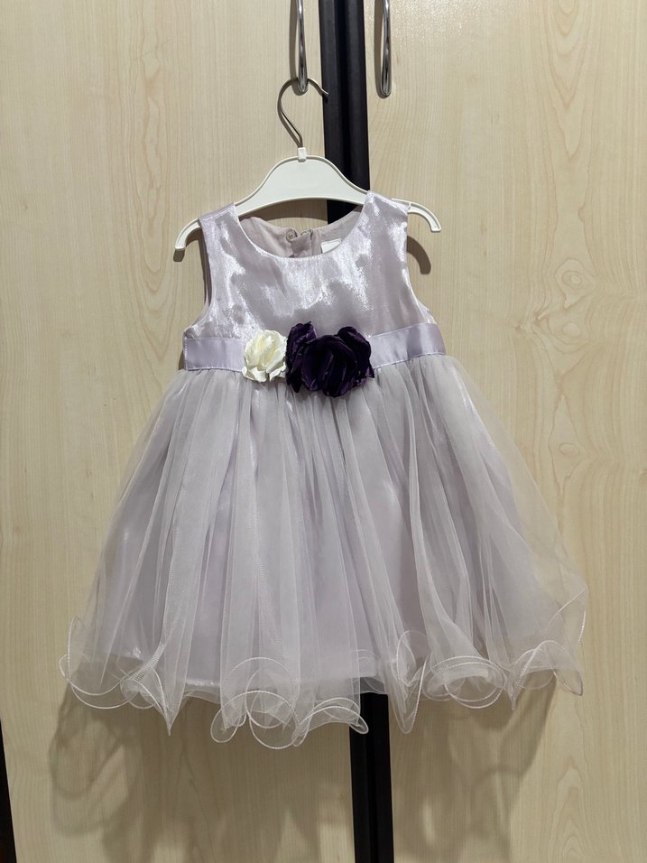 Klasik şıklıkta, çiçek desenli ve fırfırlı etekli, kolsuz, mor ve gri tonlarında, vücuda oturan kız çocuk elbisesi.