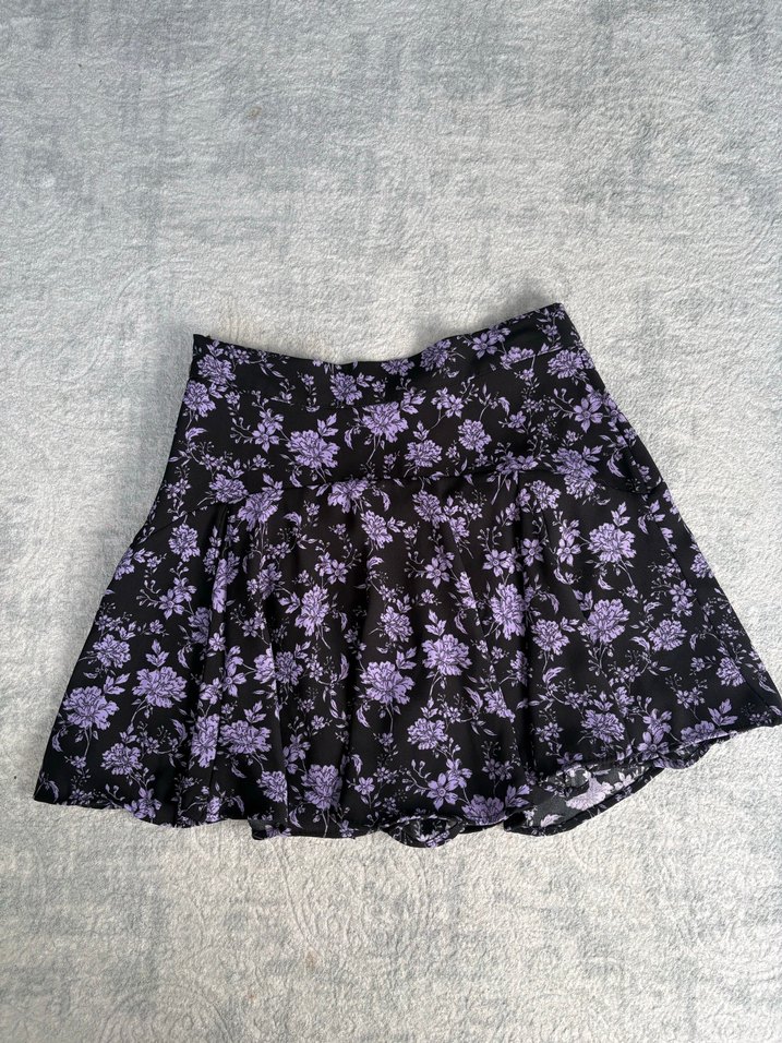 Şortlu yandan fermuarlı siyah ama mor çiçek detaylı hiç giyilmemiş mini etek