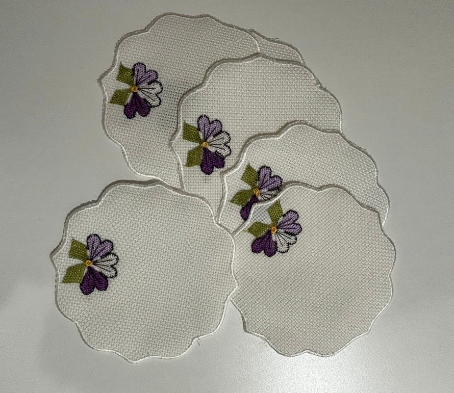 Vintage tarzda, mor çiçek nakışlı, el yapımı ve dokulu kumaştan peçeteler. Her biri zarif dalgalı kenarlara sahiptir.