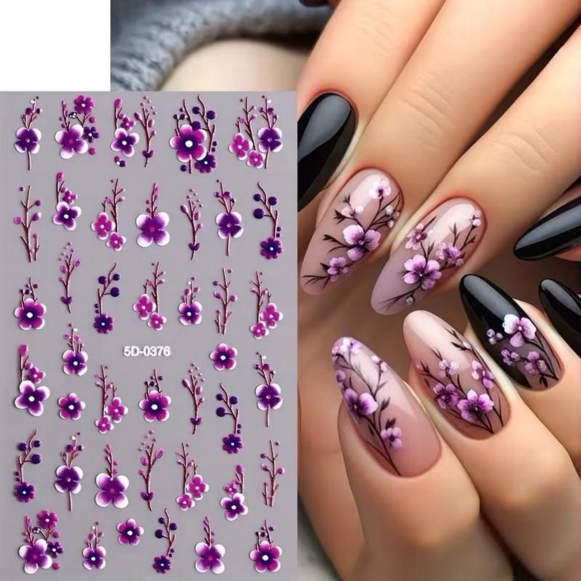 Farklı mor çiçek ve dal desenlerine sahip koyu mor tırnak süslemeleri, kendinden yapışkanlı ve 3d dir