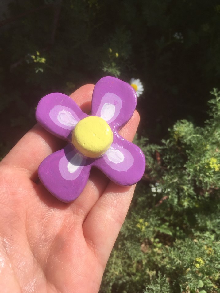 Mor renkli, sarı merkezli çiçek desenli, düğmeli kadın broşu, bohem ve minimalist tarz için uygundur.