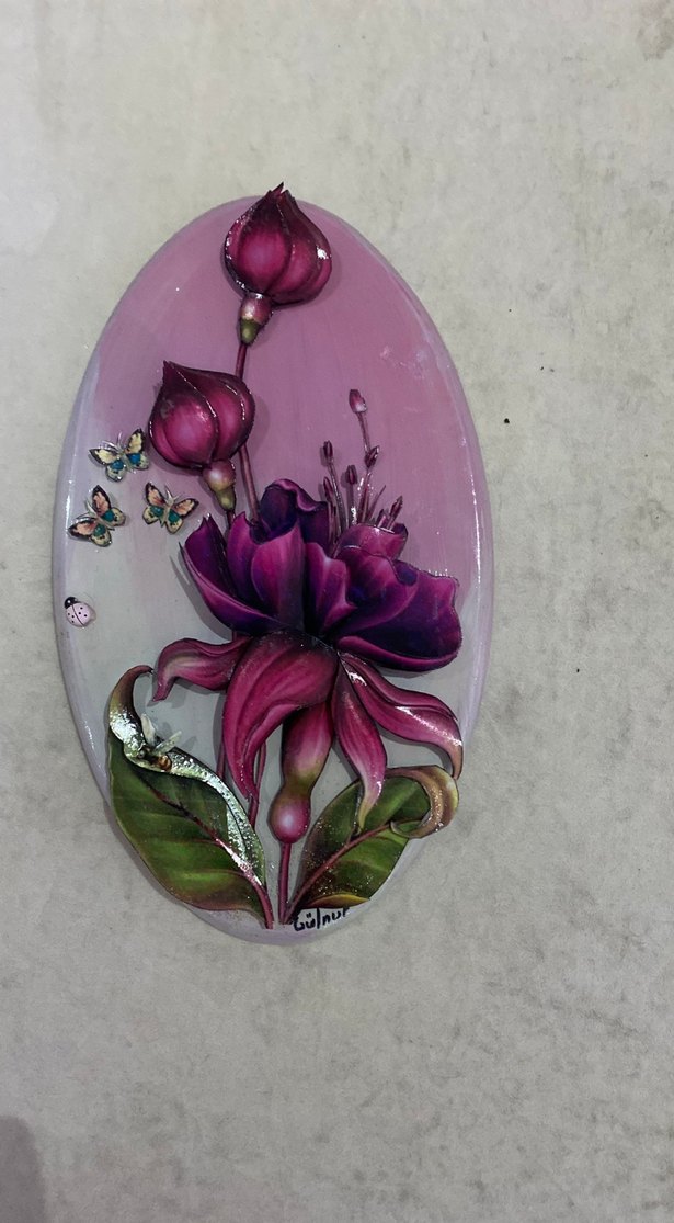 Oval şekilli tablo, açık mor zemin üzerinde koyu mor çiçekler, yeşil yapraklar ve küçük kelebekler içerir.