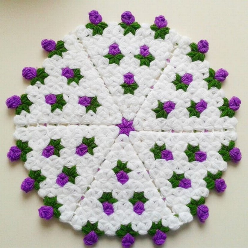 Mor çiçekler ve yeşil yapraklarla süslenmiş beyaz örgü lif
