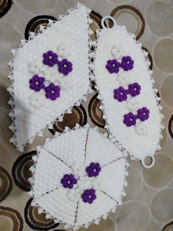 Mor Çiçekli Beyaz Örgü lif Seti