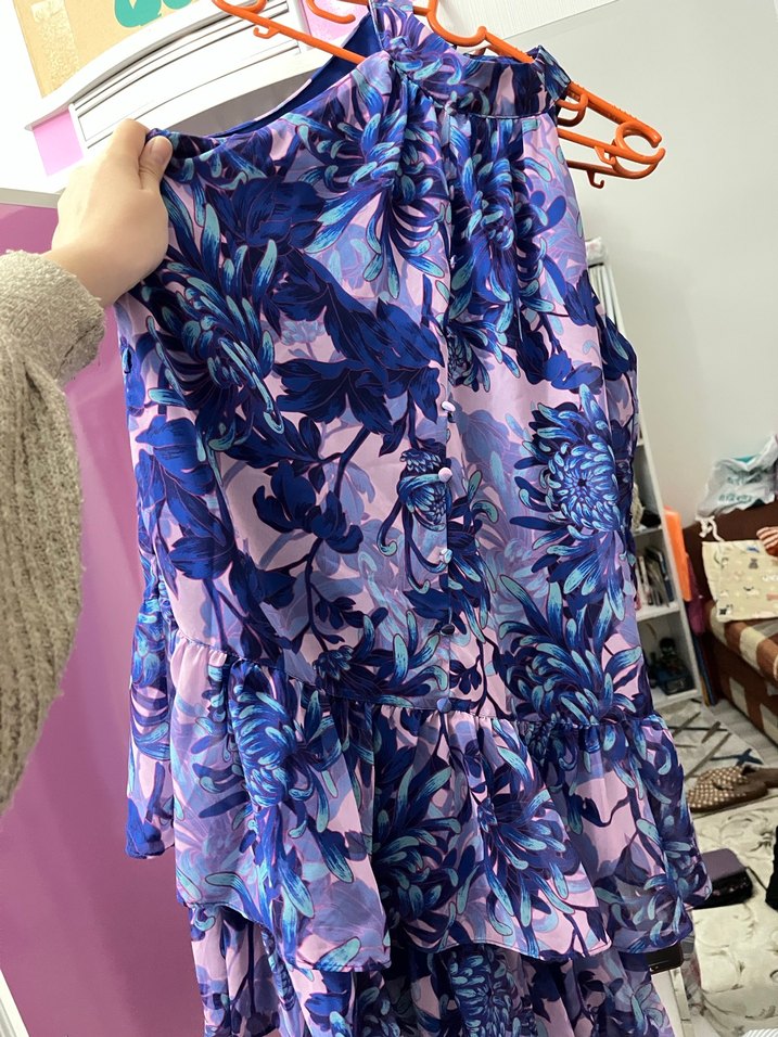Mor çiçek desenli, askısız ve salaş kesimli bu uzun elbise, yumuşak sentetik kumaştan yapılmış bohem tarzda drapeli katmanlara sahiptir.