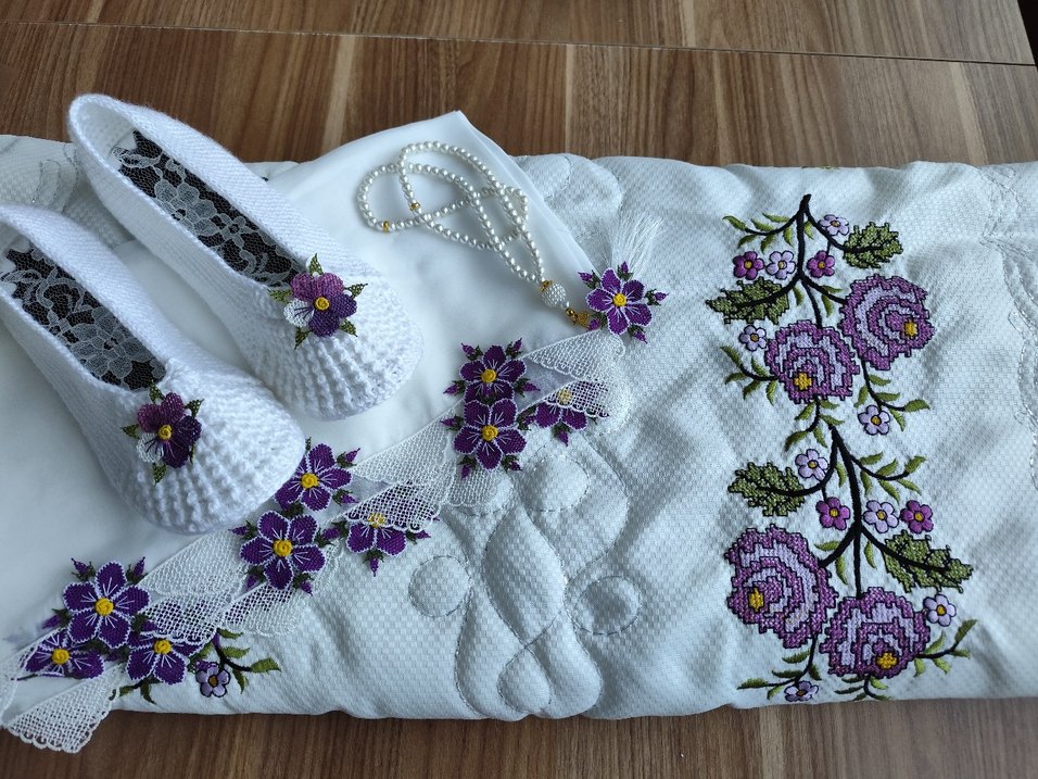 Mor çiçek işlemeleriyle süslenmiş beyaz dokulu kumaştan bebek seti, patik ve çiçekli kolye ile tamamlanmıştır.