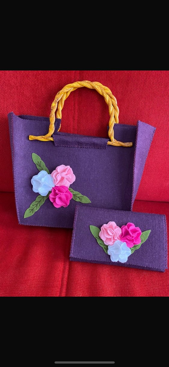 Keçe kumaştan, örgü saplı, renkli fırfırlı çiçek detaylı mor bohem tarzı kadın çantası ve cüzdan seti.