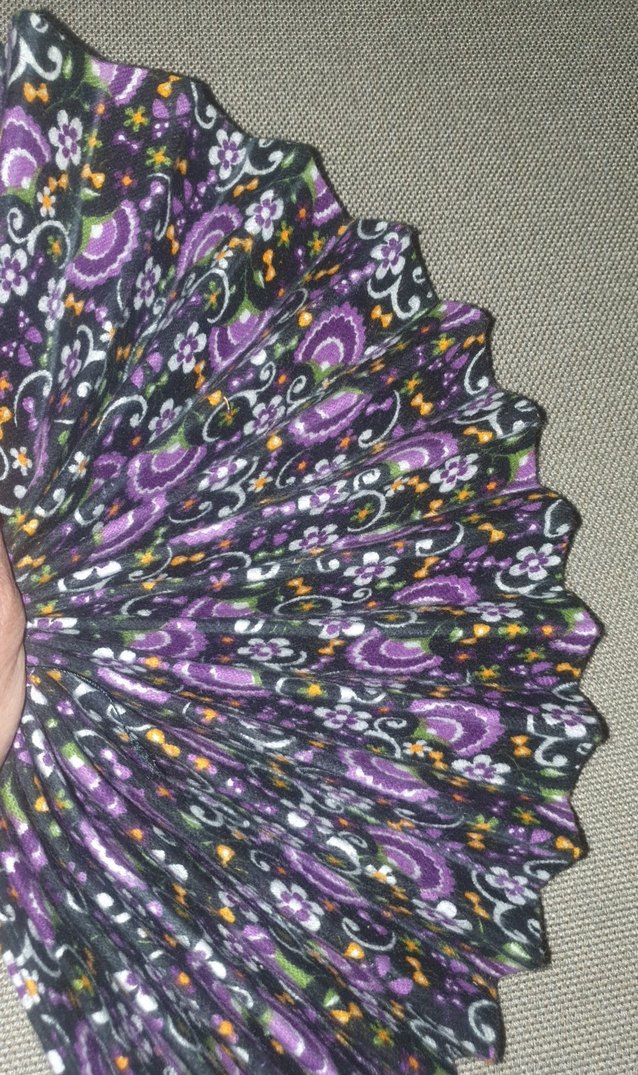 Küçük turuncu ve beyaz detaylarla süslü koyu mor çiçek desenli katlanabilir yelpaze. Taşıması kolay ve pratiktir.