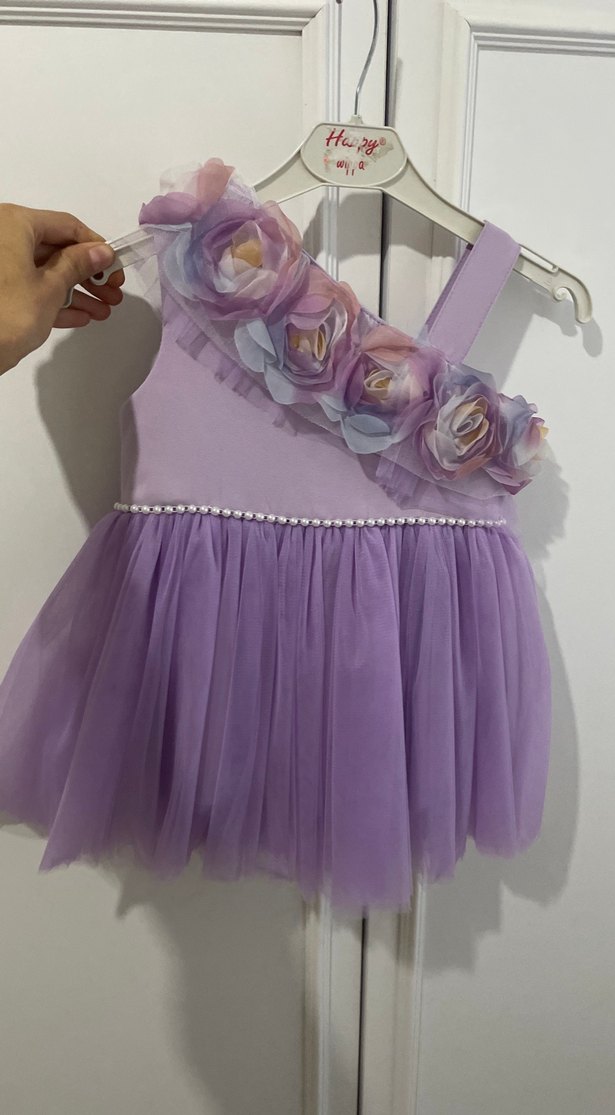Mor renkli, çiçekli fırfırlı askısız, bohem tarzda kız çocuk abiye elbise. Sentetik kumaştan, dar kesim ve zarif detaylara sahip. Sıfır hiç kullanılmadı