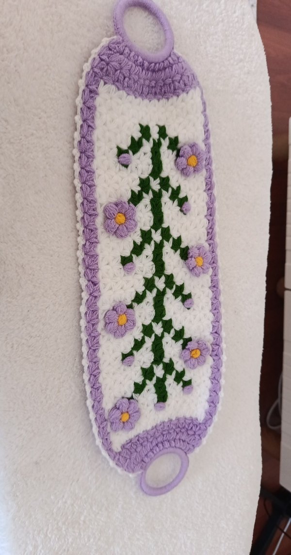 Pastel mor renkli, mor çiçek ve yeşil yaprak desenli örgü banyo süngeri, nazik dokusu ile banyo keyfi sağlar.