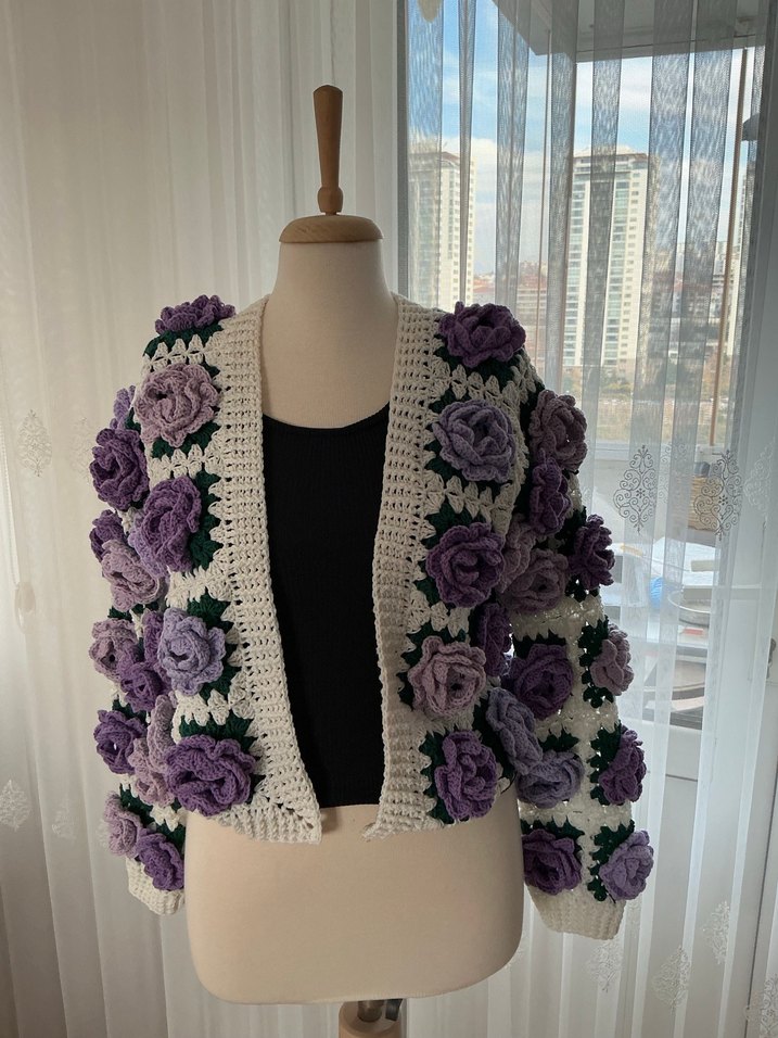 Mor Çiçekli Örgü Bohem Hırka