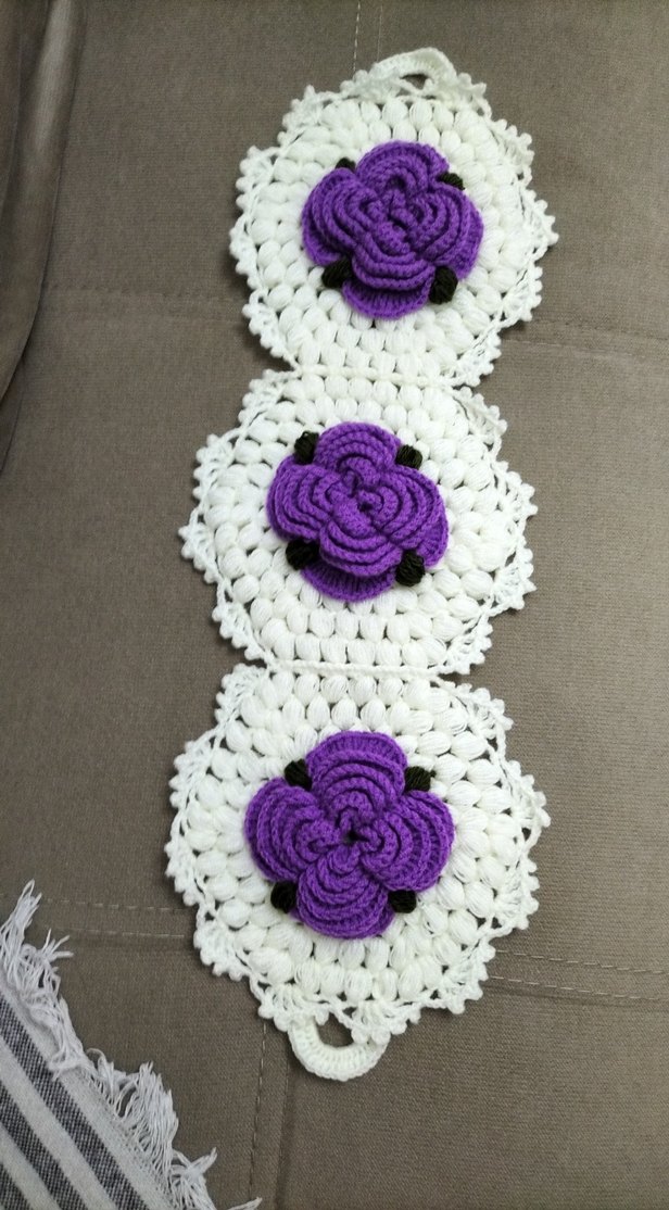 mor örgü çiçeklerin yer aldığı el yapımı lif. #lif #mor #cicek #ceyiz #banyo #dugun #bohca