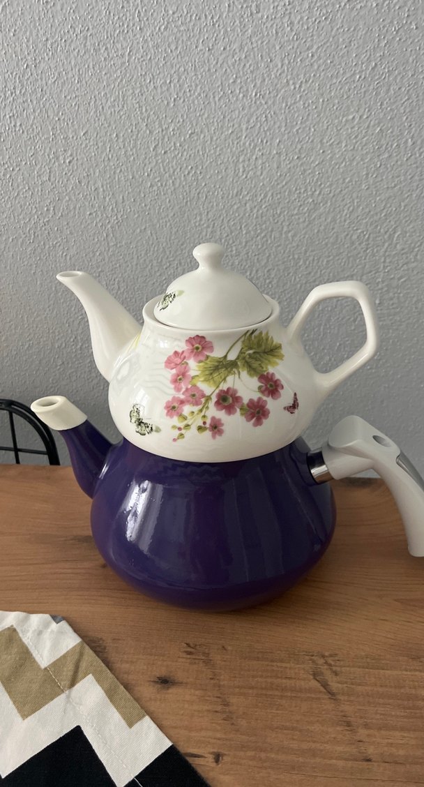 Pastel mor renkte, beyaz üst kısmında çiçek desenleri bulunan parlak tabanlı bir çaydanlıktır. Klasik ve yumuşak renklerin birleşimi. Üst kısm porselen alt emaye !!