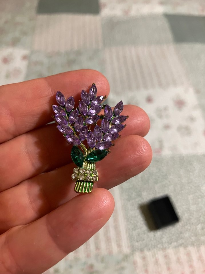 Koyu mor payetli çiçek yaprakları ve yeşil detaylarla vintage bohem tarzında tasarlanmış broş. Düğünlerde ve retro hippie stillerde kullanılabilir.