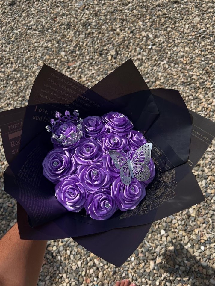 Mor çiçek desenli payetli kadın broş, kelebek ve taç süslemeleriyle, gösterişli ve yenilikçi düğün stilleri için uygundur.