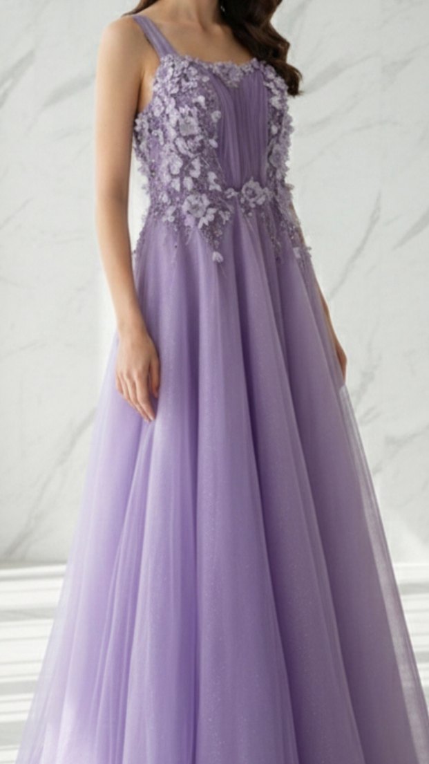 Mor renkli, çiçekli fırfır detaylı, askısız ve uzun boy abiye elbise, düğün için uygun.