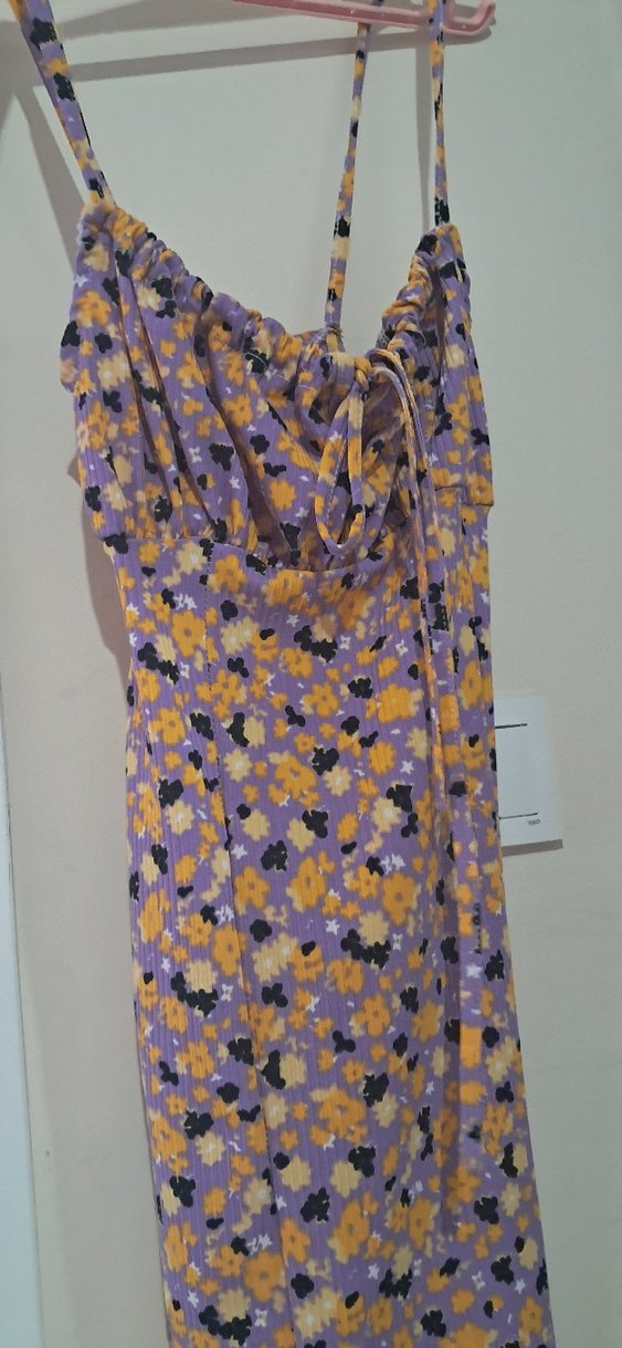 Mor Çiçekli Uzun Askılı Günlük Elbise yırtmaçlı
