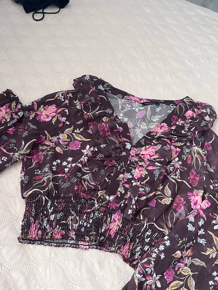 Mor renkli, V yakalı, kısa kollu, bol kesim ve fırfır detaylı bluz. Çiçekli desenli ve kısa boyda, bohem tarzı için uygun.