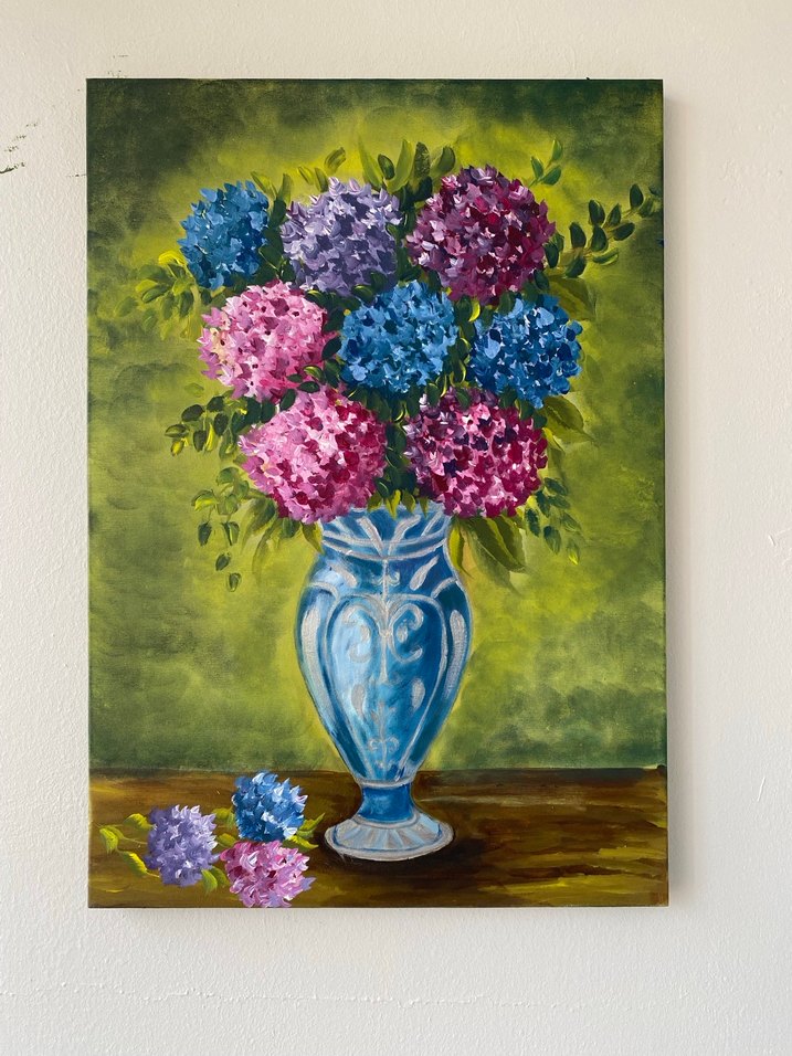 35/50 Yeşil fon üzerinde mor, sarı ve mavi çiçeklerle dolu koyu renkli vazoyu gösteren akrilik boya tablo. Ahşap yüzeyde vazoya düşen yapraklar var.