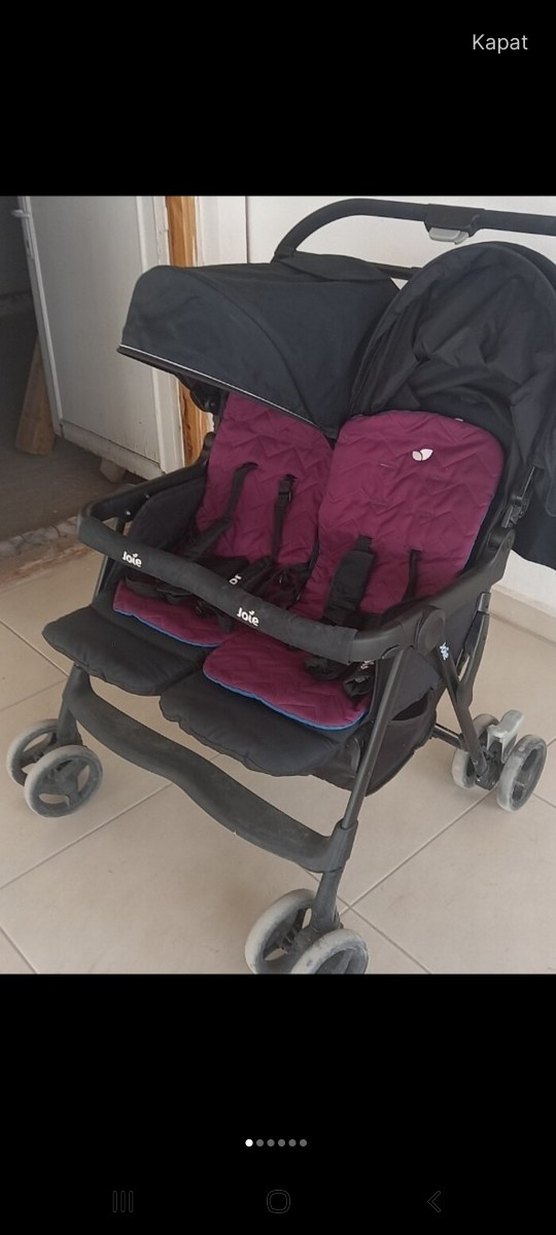 İki çocuk için ayarlanabilir tente ve emniyet kemerleri bulunan mor çiftli bebek arabası. Kolay hareket için yumuşak tekerlekler. yağmurluk mevcut