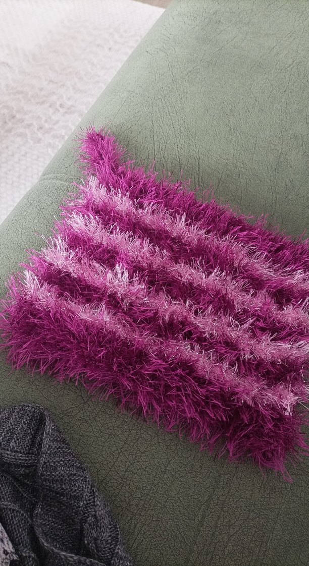 Mor çizgili, renkli ve yumuşak dokulu lif el örgüsü yeni ördüm