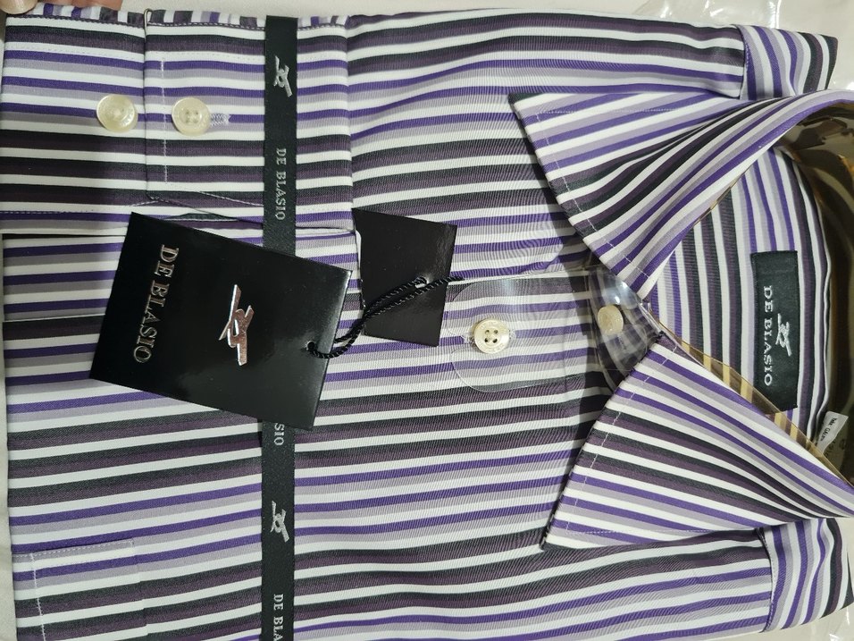 Mor çizgili, düğmeli yakalı erkek gömleği, trend casual iş stiline uygun.