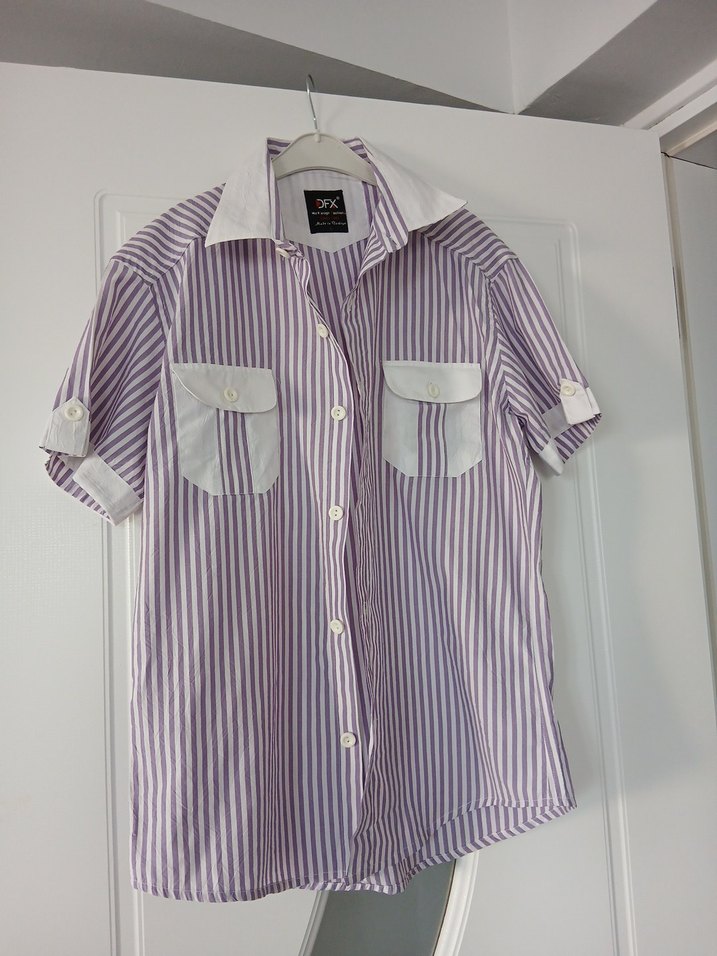 Kısa kollu, yakalı ve düğmeli ön kısmı olan erkek gömleği. Pamuklu, normal kesim ve pastel mor çizgilerle günlük rahat stil için uygun. göğüs 54 boy 73