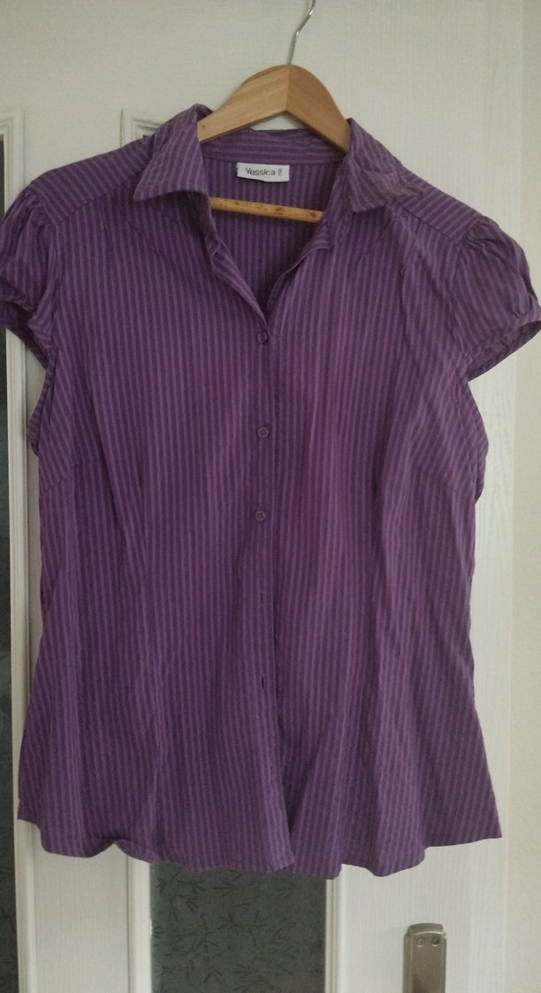 Mor çizgili, kısa kollu, yakalı ve düğmeli kadın gömleği. Sentetik kumaştan, midi boy ve normal kesim. Ofis ve gündelik kullanım için uygun.