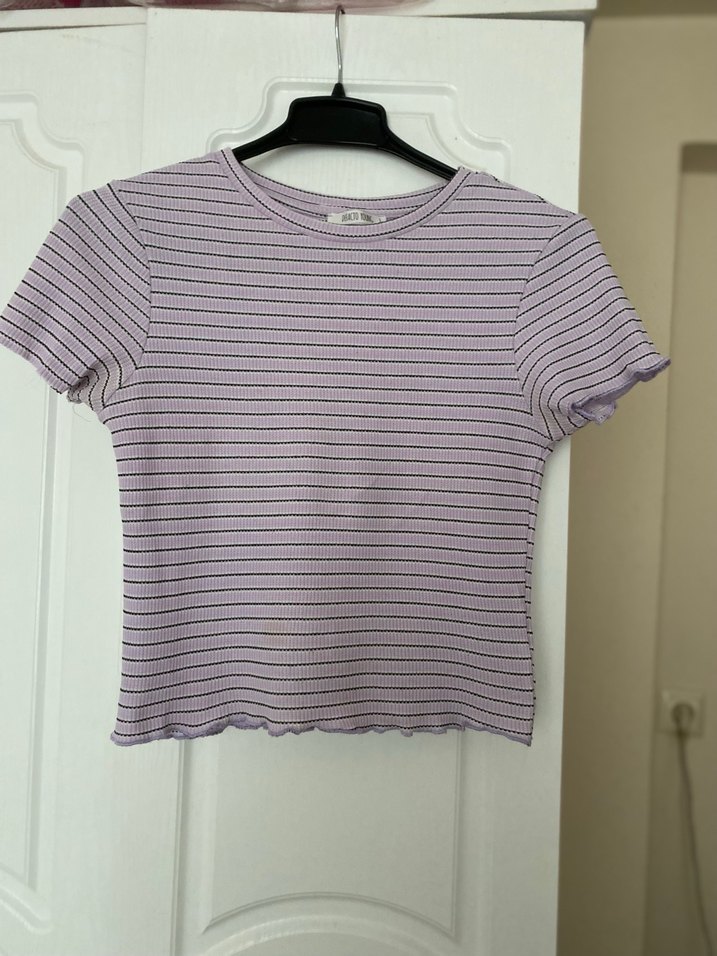 Mor, çizgili, kısa kollu, fitted kesim kadın tişörtü. Pliseli kenarları ve pastel renkleriyle günlük sokak stiline uygundur.