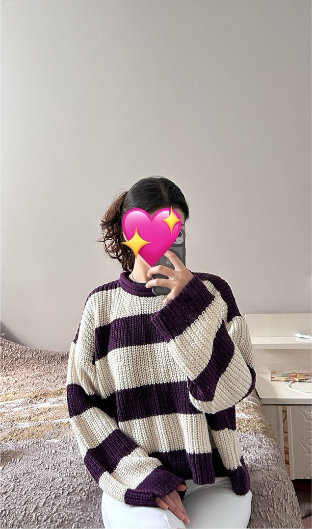 Mor ve krem renkli çizgili, örgü yapıda, bol kesim, yüksek yakalı ve uzun kollu kadın kazak. Günlük kullanım için rahat ve retro tarzda.