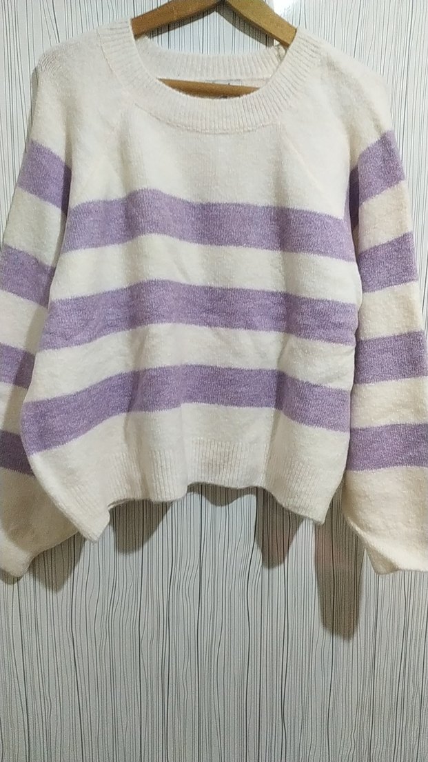 Mor ve beyaz çizgili, örgü, uzun kollu, yuvarlak yaka, bol kesim kadın kazak. Rahat ve günlük kullanıma uygun. hiç giyilmesi sadece Bir kusuru var arkada iz var yıkanınca geçebilecek .eni 62 boyu 52