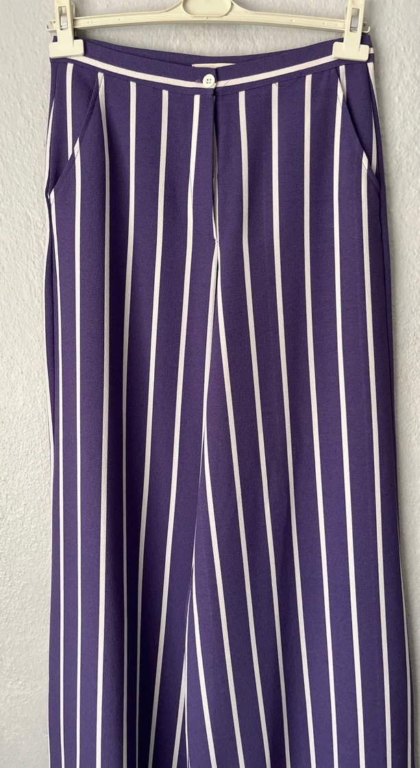 Mor uzun boy çizgili kumaş pantolon.