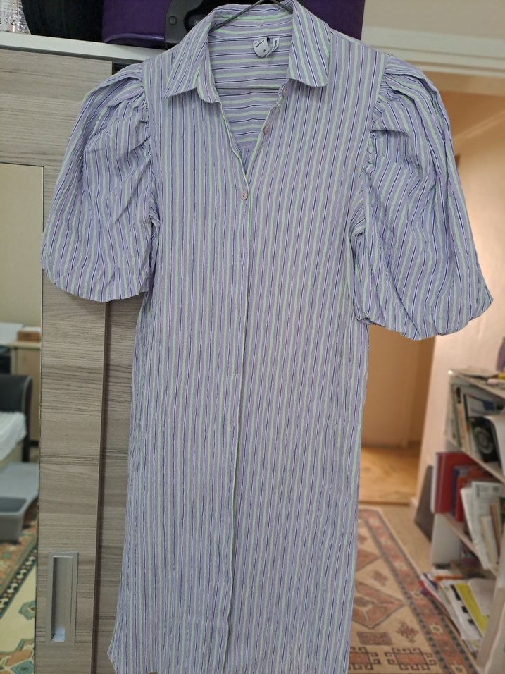 Pastel mor renkte, kısa balon kollu, düğmeli, salaş kesim çizgili kadın gömlek elbise, Günlük kullanım için uygun, hiç kullanılmadı, etiketi kesildi