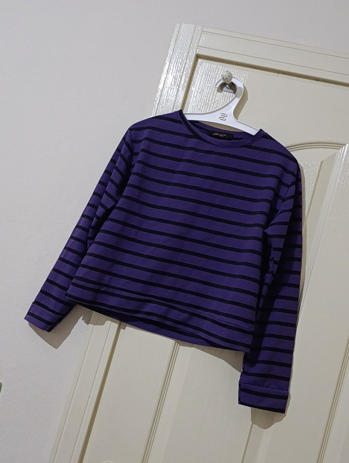 Uzun kollu, yuvarlak yakalı kadın sweatshirtü. Mor ve siyah çizgili, salaş kesim ve yumuşak, sıcak kumaştan yapılmıştır. Günlük kullanıma uygundur.
