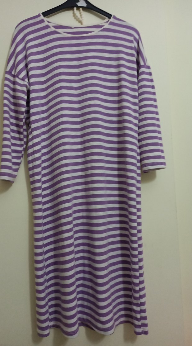 Uzun boy, mor pastel çizgili, kayık yaka ve uzun kollu bol kesim ince tunik