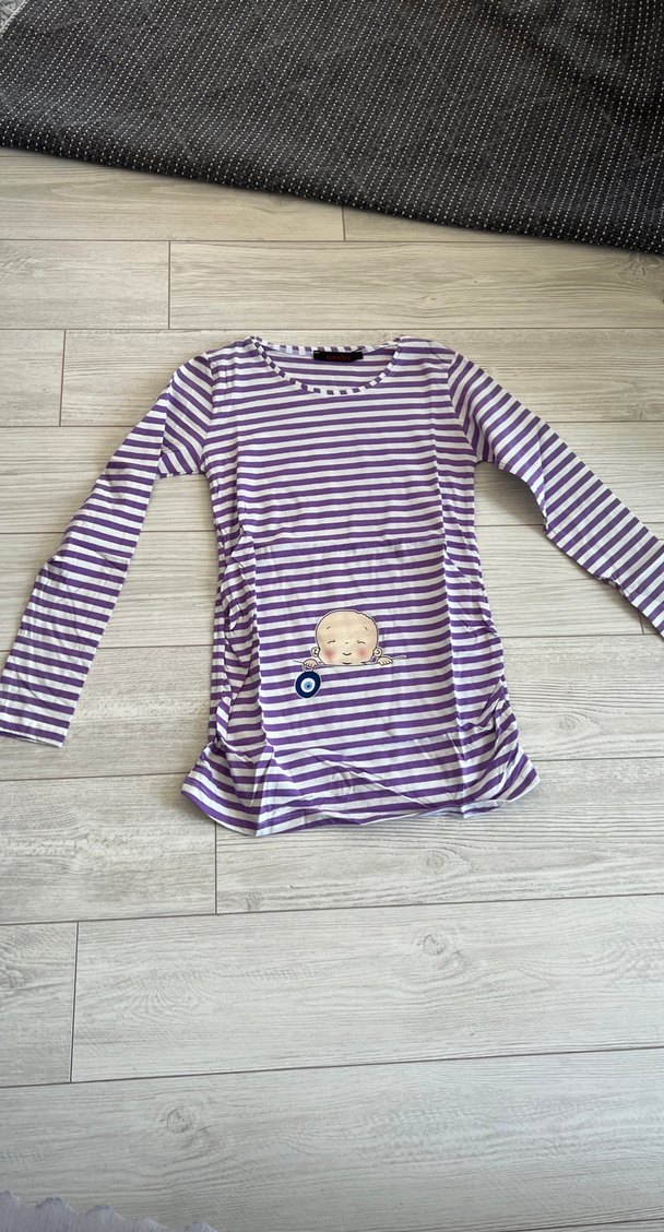 Mor ve gri çizgili, uzun kollu, bisiklet yaka ve düğmeli hamile tişörtü. Yumuşak kumaştan yapılmıştır, önünde sevimli bebek baskısı vardır.