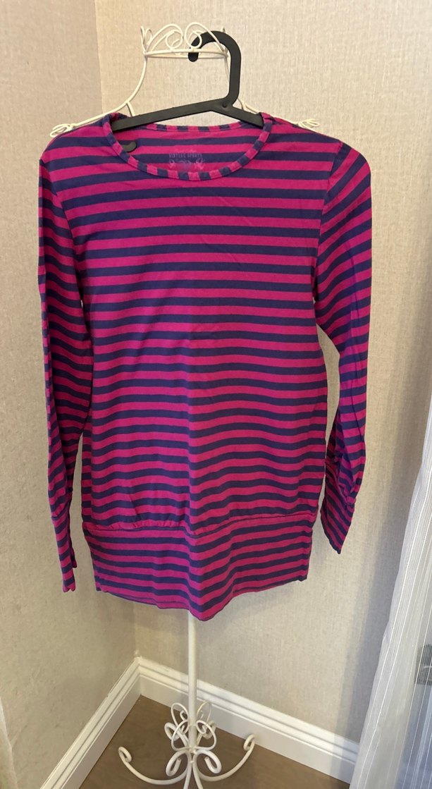 Mor ve koyu tonlarda çizgili, uzun kollu ve yuvarlak yakalı kız tişörtü. Düğmeli detaylara sahip, sentetik yumuşak kumaştan, sokak stili için uygun.boyu 67 cm eni 40 cm